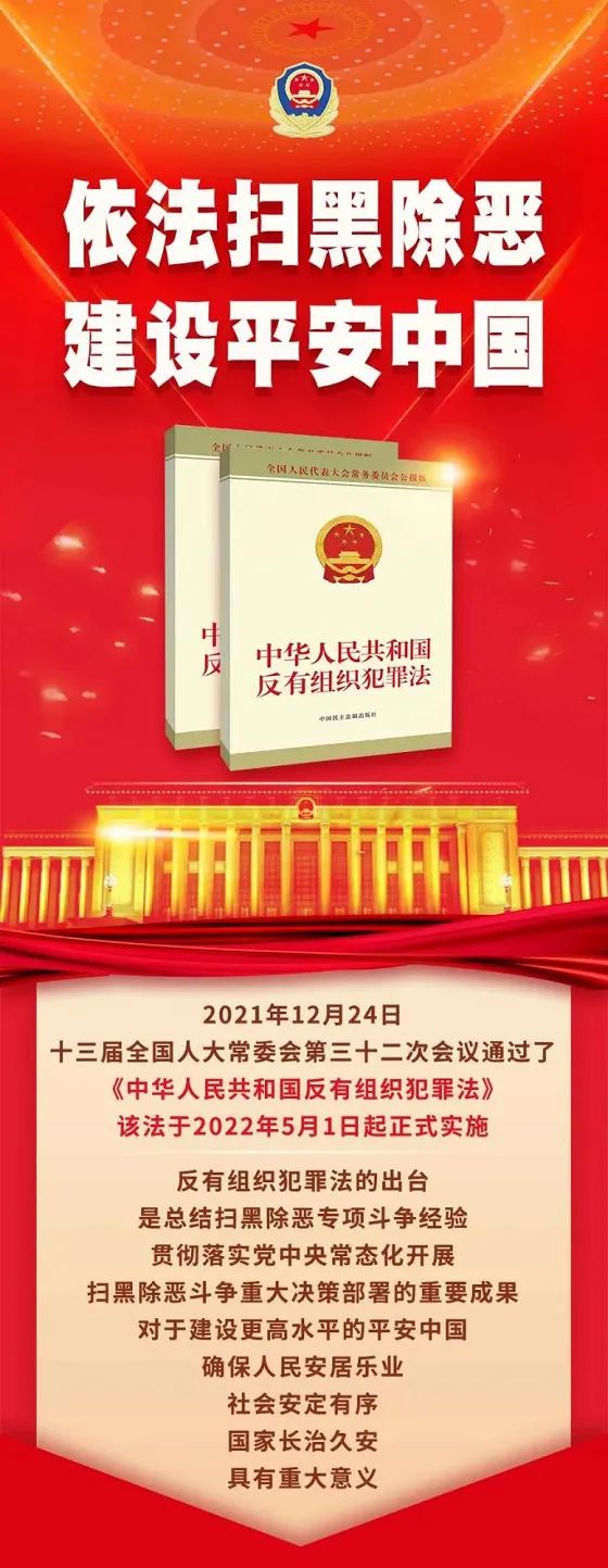 2021年12月24日,十三届全国人大常委会第三十二次会议通过了《中华人民共和国反有组织犯罪法》,该法将于2022年5月1日正式实施。