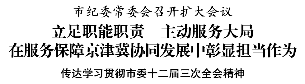 会议要求,全市各级纪检监察机关要立足职能职责,主动服务大局,在服务保障京津冀协同发展中彰显担当作为。要强化政治监督,贯彻落实习近平总书记关于京津冀协同发展一系列重要讲话和重要指示批示精神,聚焦全会各项部署要求,围绕北京非首都功能疏解、支持北京“新两翼”建设、加强协同创新和产业协作、建设美丽宜居京津冀等重点任务,具体化、精准化、常态化开展政治监督,保障京津冀协同发展决策部署落实。要坚定不移正风肃纪反腐,紧盯京津冀协同发展涉及的重大项目、重点工作、重要环节,坚决整治重点领域腐败问题,持续净化天津政治生态,纵深推进全面从严治党,为京津冀协同发展清障护航。要坚持严管厚爱结合,树牢“纪检监察机关也是干部之家”的理念,认真落实“三个区分开来”,激励广大干部在推进京津冀协同发展中放下包袱、甩开膀子,敢闯敢试、敢干敢为,凝聚起推进京津冀协同发展合力。要坚持人民至上,聚焦公共服务共建共享,紧盯教育、医疗卫生、社会保障、文化旅游协同发展,加强监督检查,深化点题整治和专项整治,让京津冀协同发展成果惠及于民。