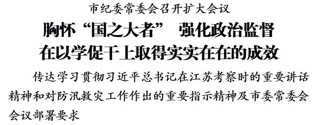 日前,市纪委常委会召开扩大会议,传达学习习近平总书记在江苏考察时的重要讲话精神和对防汛救灾工作作出的重要指示精神及市委常委会会议部署要求,研究贯彻落实措施。市委常委、市纪委书记、市监委主任陈辐宽主持会议并讲话。