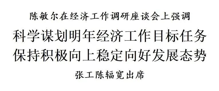 12月5日,市委书记陈敏尔主持召开经济工作调研座谈会。他强调,要深入学习贯彻习近平经济思想,全面落实习近平总书记视察天津重要讲话精神,认真总结盘点今年工作,客观分析当前经济形势,科学谋划明年全市经济工作,用好战略机遇、政策效应、工作抓手、生产要素、干部人才,保持积极向上、稳定向好的发展态势,扎实推动经济高质量发展。