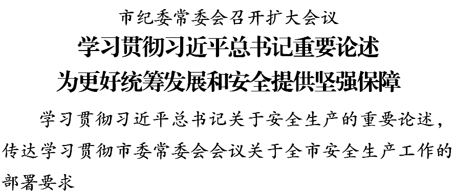 日前,市纪委常委会召开扩大会议,学习贯彻习近平总书记关于安全生产的重要论述,传达学习市委常委会会议关于全市安全生产工作的部署要求,研究贯彻落实措施。市委常委、市纪委书记、市监委主任陈辐宽主持会议并讲话。