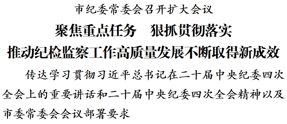 日前,市纪委常委会召开扩大会议,传达学习习近平总书记在二十届中央纪委四次全会上的重要讲话和二十届中央纪委四次全会精神以及市委常委会会议部署要求,研究贯彻落实措施。市委常委、市纪委书记、市监委代理主任王庭凯主持会议并讲话。