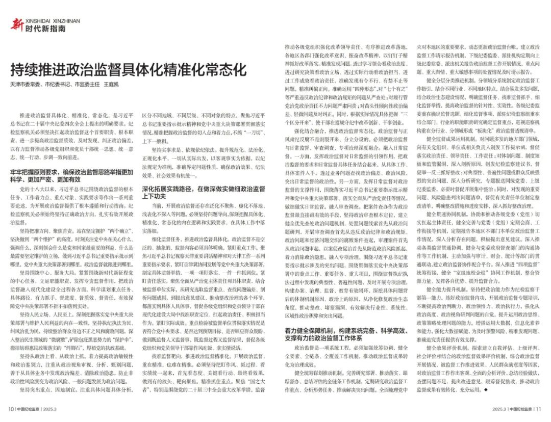 2025年第3期《中国纪检监察》杂志刊发天津市委常委、市纪委书记、市监委主任王庭凯的署名文章《持续推进政治监督具体化精准化常态化》。现予以全文转载。